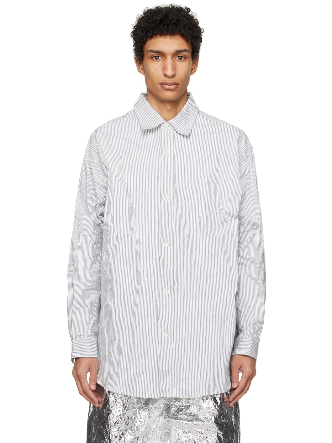 Crinkled aluminum-coated cotton poplin shirt. Pinstripes throughout. · Spread collar · Button closure · Shirttail hem · Single-button French cuffs · Twin pleats at back yoke Supplier color: Natural 77% cotton, 23% aluminum. Made in Tunisia 241897M192005