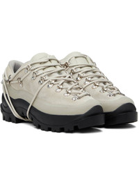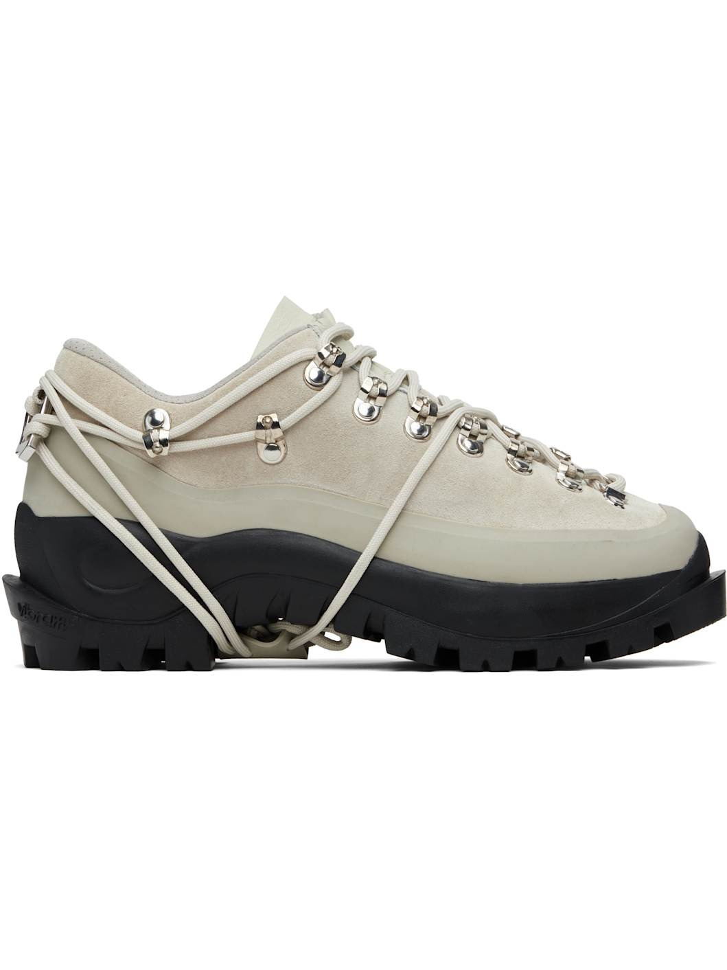 Low-top suede boots. · Lace-up detailing throughout · Lace-up closure · Logo embossed at padded tongue · Padded collar · Carabiner-style clasp at heel tab · Mesh lining · Rubber trim at welt · Treaded Vibram® rubber platform sole · Platform: H1.75" Supplier color: Stone Upper: leather. Sole: rubber. Made in Italy 252295M255002