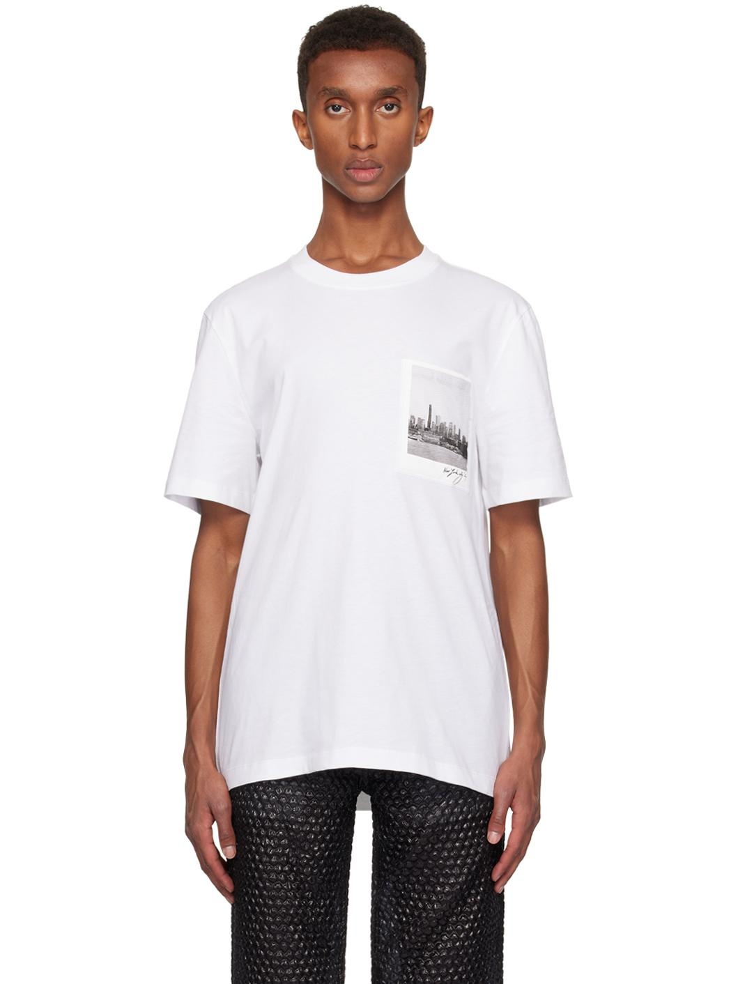Lightweight cotton jersey T-shirt. · Relaxed-fit · Rib-knit crewneck · Graphic printed at padded patch pocket · Logo and text printed at back Supplier color: White Body: 100% cotton. Fill: 100% polyester. Made in Portugal 251154M213000