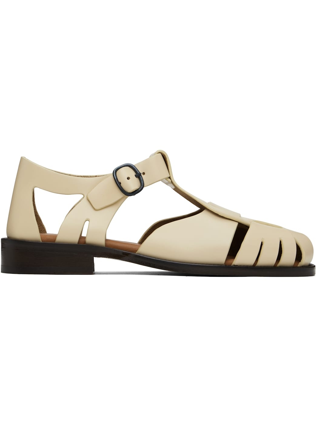 Handcrafted polished calfskin flat sandals in beige. · Cutouts throughout · Pin-buckle ankle strap · Logo embossed at padded calfskin footbed · Suede lining · Serrated detailing at welt · Stacked calfskin heel and midsole · Calfskin sole with rubber injection Supplier color: Custard Upper: calfskin. Sole: calfskin, rubber. Made in Spain 251991F124001