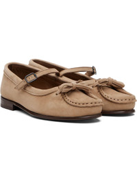 Calfskin nubuck flats. · Moc toe · Bow at vamp · Mary Jane-style pin-buckle strap · Buffed leather lining · Stacked leather heel with rubber injection · Calfskin sole Supplier color: Caramel Upper: calfskin. Sole: calfskin, rubber. Made in Spain 252991F118010