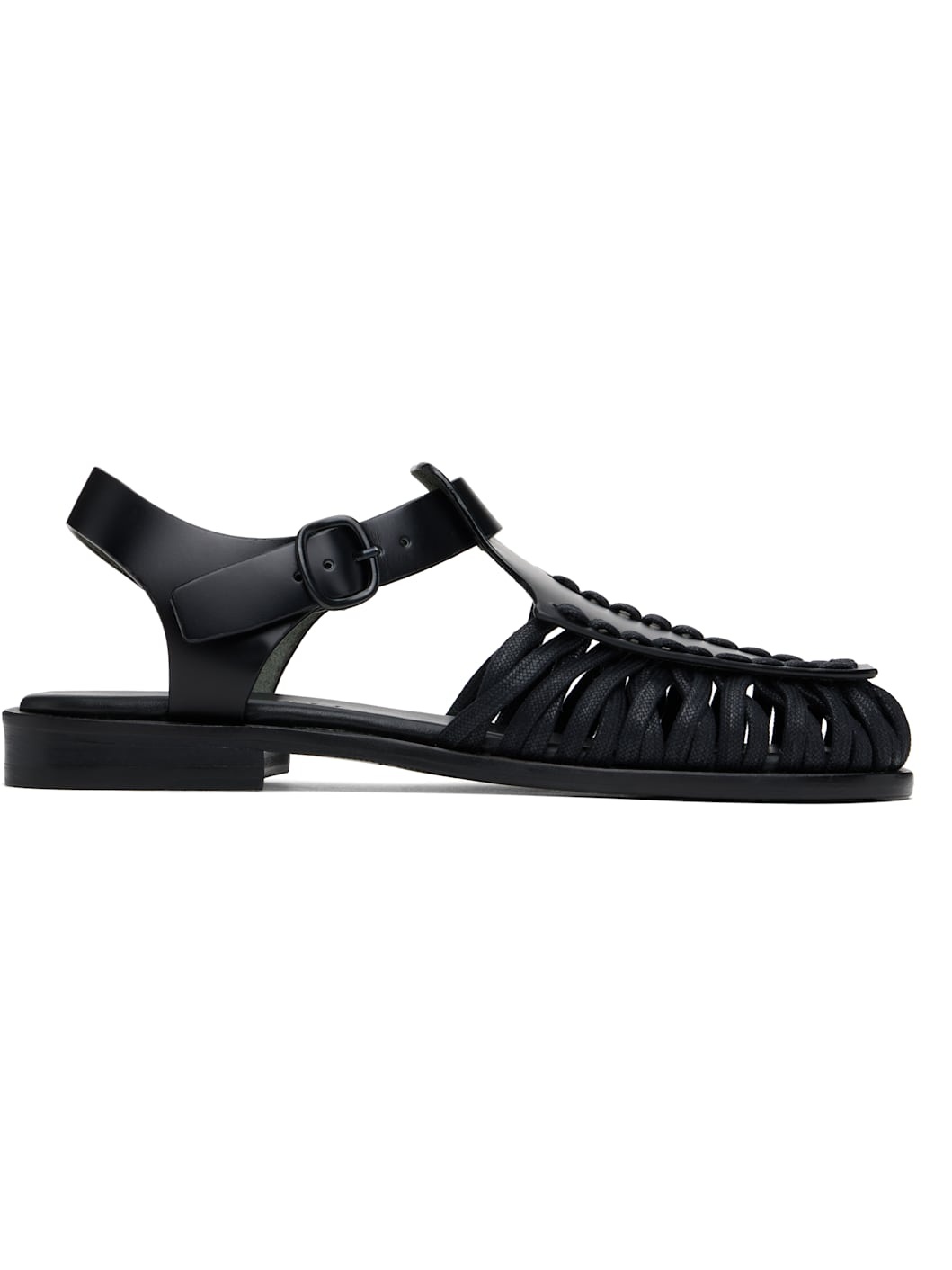 Handcrafted polished calfskin flat sandals in black. · Square toe · Woven lace-up detailing at vamp · Pin-buckle ankle strap · Logo embossed at padded calfskin footbed · Stacked calfskin heel and midsole · Calfskin sole with rubber injection Supplier color: Black Upper: calfskin, cotton. Sole: calfskin, rubber. Made in Spain 251991F124007