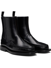 Handcrafted ankle-high buffed calfskin boots. · Paneled construction · Moc toe · Zip closure at inner side · Webbing pull-loop at heel collar · Pinched seam at heel counter · Stacked calfskin heel · Calfskin sole Supplier color: Black Calfskin. Made in Spain 252991F113007