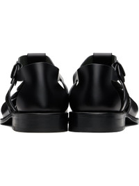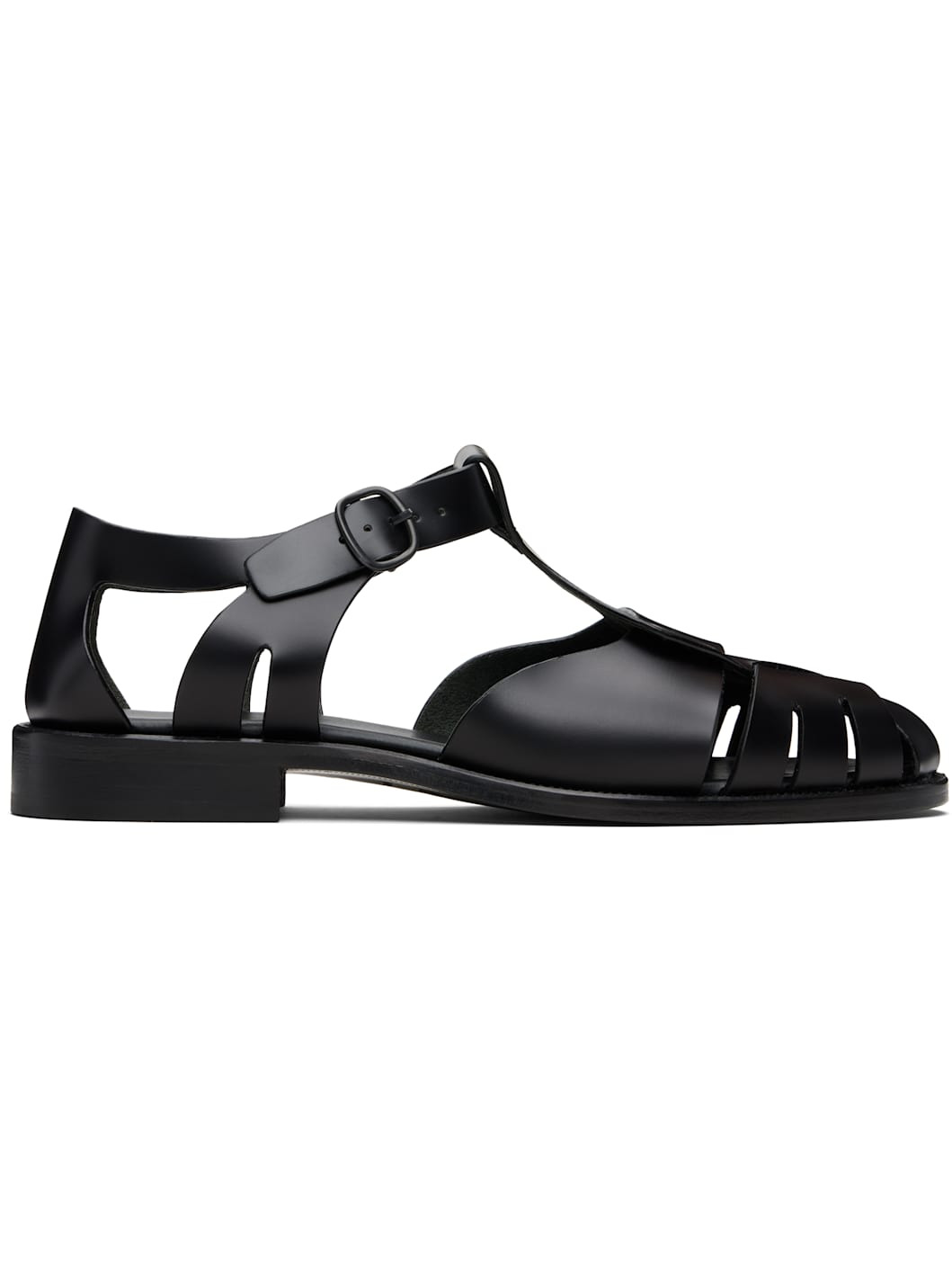 Handcrafted buffed calfskin sandals. · Cutouts throughout · Woven detailing at vamp · Pin-buckle ankle strap · Logo embossed at padded footbed · Stacked calfskin heel · Calfskin sole Supplier color: Black Calfskin. Made in Spain 252991M234005