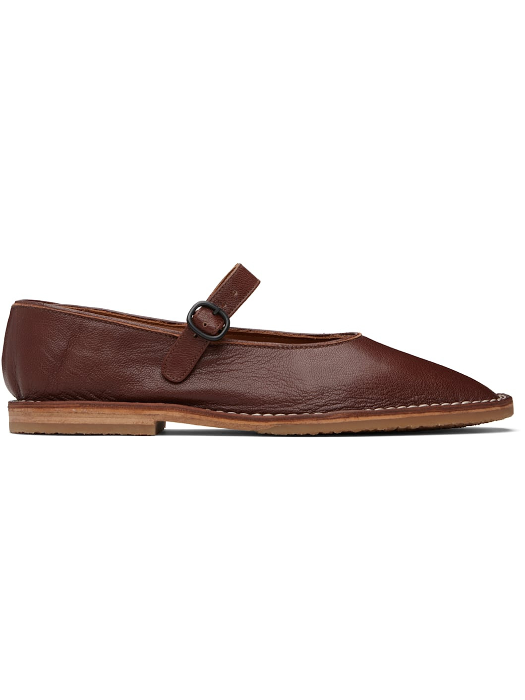 Handcrafted grained lambskin Mary Janes. · Square toe · Pin-buckle strap at vamp · Grained leather lining · Topstitching at welt · Stacked leather heel with rubber injection · Leather sole with rubber injection Supplier color: Chestnut Upper: lambskin. Sole: leather, rubber. Made in Spain 252991F118007