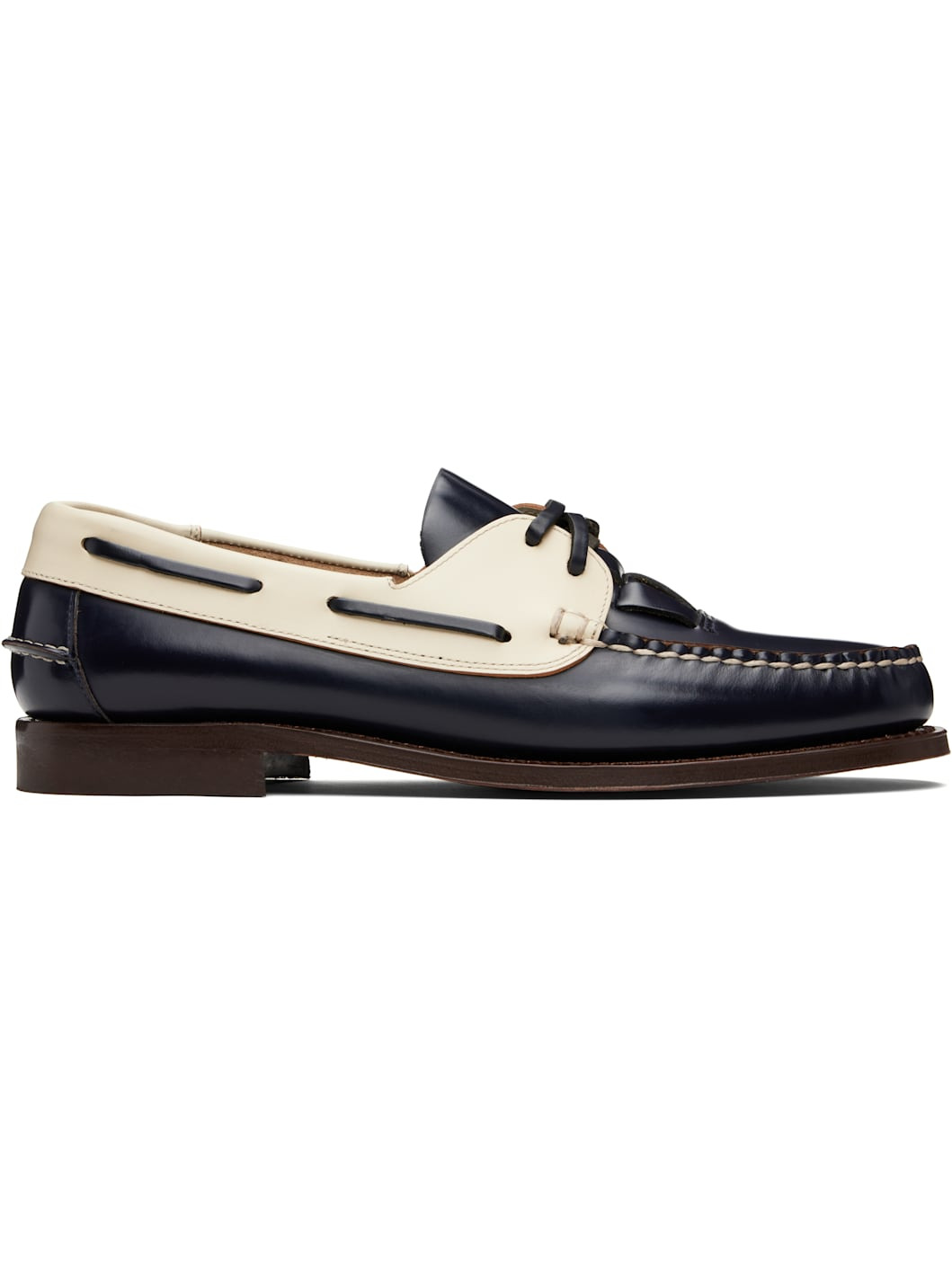 Handcrafted buffed calfskin loafers. · Moc toe · Woven detailing at vamp · Lace-up detailing at vamp and collar · Pinched seam at heel counter · Suede interior · Stacked calfskin heel · Calfskin sole · Contrast stitching in off-white Supplier color: Dark navy/Custard Calfskin. Made in Spain 252991M231014