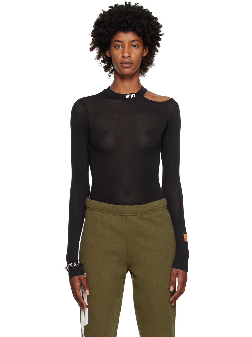 Semi-sheer knit stretch viscose T-shirt. · Logo embroidered at rib knit round neck · Cutout at shoulder · Logo patch at cuff Supplier color: Black 99% viscose, 1% elastane. Made in Portugal 231967F110046