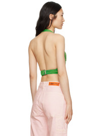 Cotton canvas corset-style tank top. Fading and subtle distressing throughout. · Paneled construction · Square neck · Logo patch at front cropped hem · Fixed halter strap · Open back · Adjustable pin-buckle strap at back hem · Unlined Supplier color: Green 100% cotton. Made in Italy 232967F111002