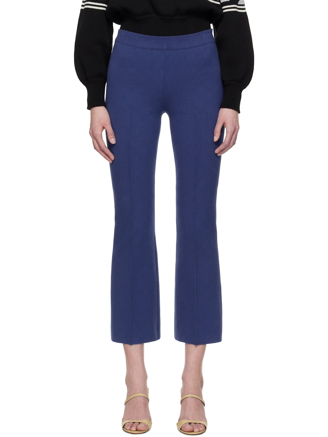 Flared knit stretch cotton-blend trousers. Subtle jacquard check pattern throughout. · Elasticized waistband · Pinched seams at front and back · Cropped cuffs · Mock welt pockets at back Supplier color: Royal blue 68% cotton, 28% nylon, 4% lycra. Made in Italy 251278F087015