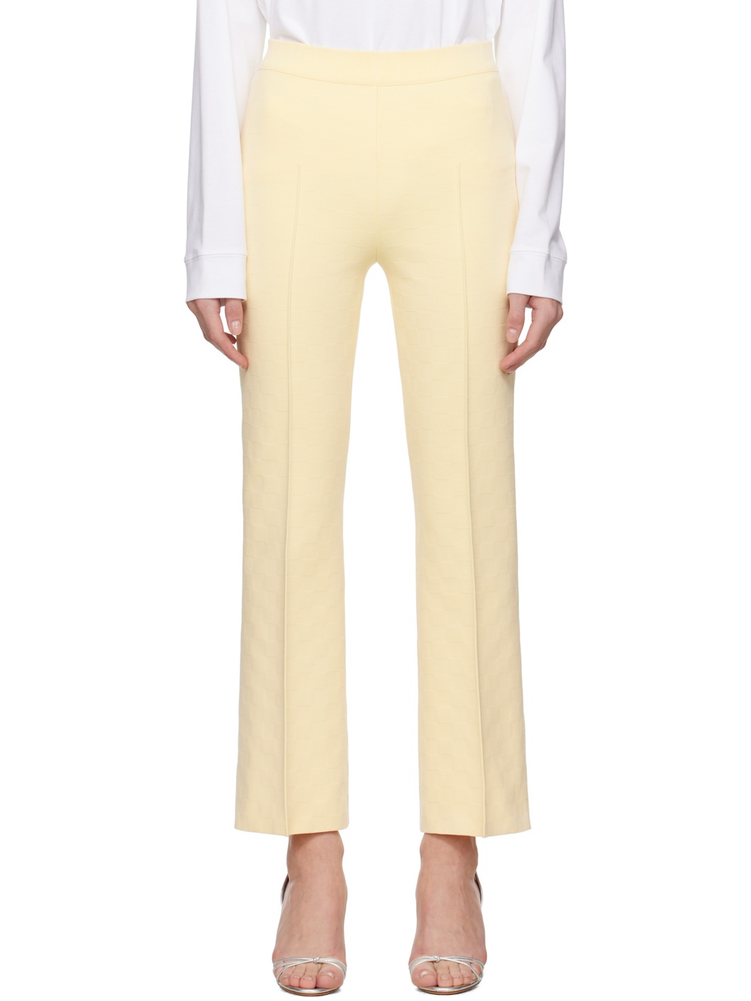 Flared knit stretch cotton-blend trousers. Jacquard check pattern throughout. · Mid-rise · Elasticized waistband · Pinched seam at legs · Cropped leg · Mock welt pockets at back Supplier color: Pale yellow 68% cotton, 28% polyamide, 4% lycra. Made in Italy 251278F087019