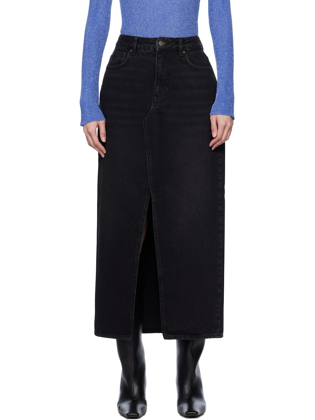 Non-stretch denim maxi skirt. Fading throughout. · High-rise · Belt loops · Five-pocket styling · Zip-fly · Central vent at front hem · Leather logo patch at back waistband Supplier color: Black 100% cotton. Made in Turkey 251946F093002