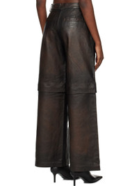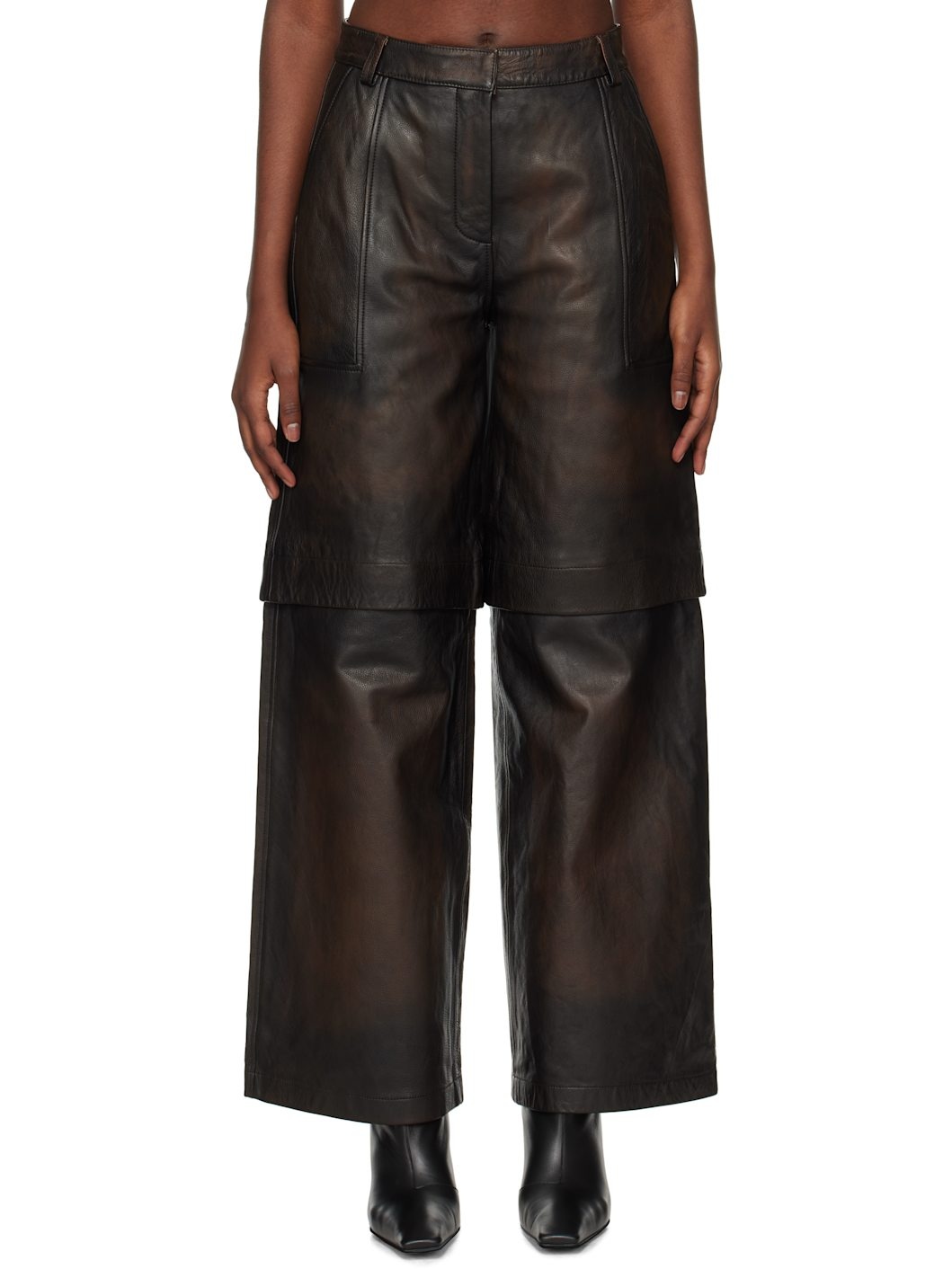Wide-leg grained leather zip-off pants. Fading throughout. · Belt loops · Four-pocket styling · Zip-fly · Zip fastening at knees for shorts styling · Full satin lining Supplier color: Brown Body: 100% leather. Lining: 100% polyester. Made in India 251946F084000