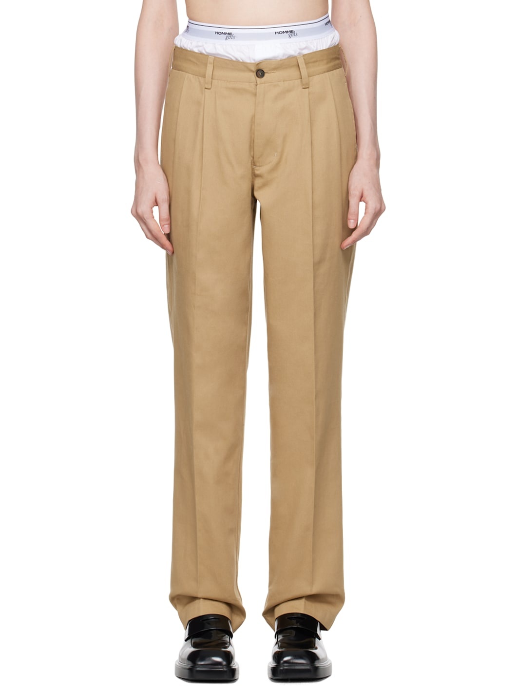 Cotton twill trousers. Logo-woven elasticized waistband at integrated cotton poplin boxer-style underlay. · Belt loops · Four-pocket styling · Zip-fly · Pleats at front · Creased legs · Logo patch at back waistband Supplier color: Khaki 100% cotton. Made in Italy 242783F087000