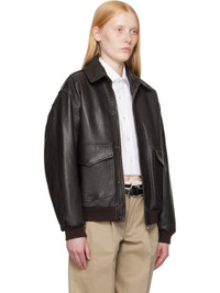 Padded grained lambskin bomber jacket. · Spread collar · Two-way zip closure with press-stud placket · Flap pockets · Rib-knit hem and cuffs · Eyelets at underarms · Dropped shoulders · Logo-woven satin twill lining Supplier color: Dark brown Body: 100% lambskin. Lining: 100% viscose. Made in Italy 252783F064001
