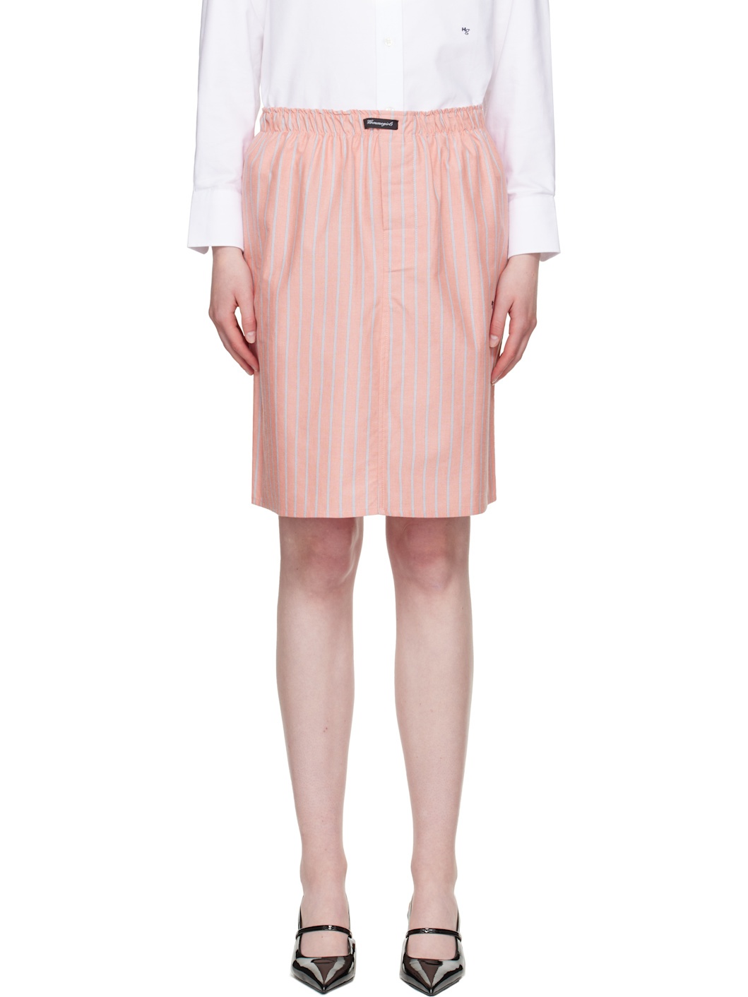 Cotton oxford cloth midi skirt. Stripes throughout. · Logo patch at elasticized waistband · Button fly · Logo embroidered at front Supplier color: Coral stripe oxford 100% cotton. Made in Italy 252783F092001