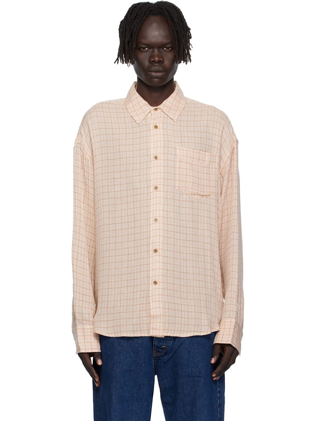 Viscose-blend flannel shirt. · Check pattern throughout · Spread collar · Button closure · Patch pocket at chest · Shirttail hem · Dropped shoulders · Adjustable buttoned barrel cuffs · Box pleat at back yoke · Corozo hardware Supplier color: Airy pink check 84% viscose, 16% wool. Made in Turkey 252995M192001