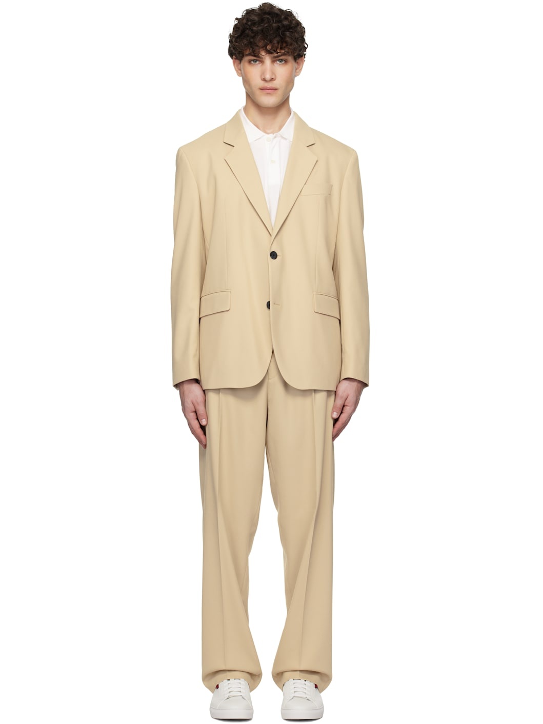Stretch polyester- and viscose-blend cavalry twill blazer. · Notched lapel · Two-button closure · Welt pocket at chest · Darts at front · Flap pockets · Four-button surgeon's cuffs · Twin vents at back hem · Welt pocket at interior · Partial satin lining Stretch polyester- and viscose-blend broadcloth trousers. · Belt loops · Four-pocket styling · Zip fly · Pleats at front · Creased legs Supplier color: Open beige Body: 66% polyester, 32% viscose, 2% elastane. Lining 1: 100% polyester. Lining 2: 65% polyester, 35% cotton. Made in Bulgaria 251084M196000