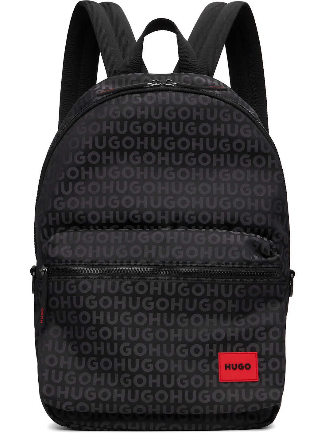Taffeta backpack. · Jacquard logo pattern throughout · Fixed carry handle · Adjustable padded shoulder straps · Rubberized logo patch and zip pocket at face · D-ring at sides · Padded panel at back face · Two-way zip closure · Zip pocket and laptop compartment at interior · H16.5" x W14" x D5.5" Supplier color: Black Textile. Made in Viet Nam 252084M166012