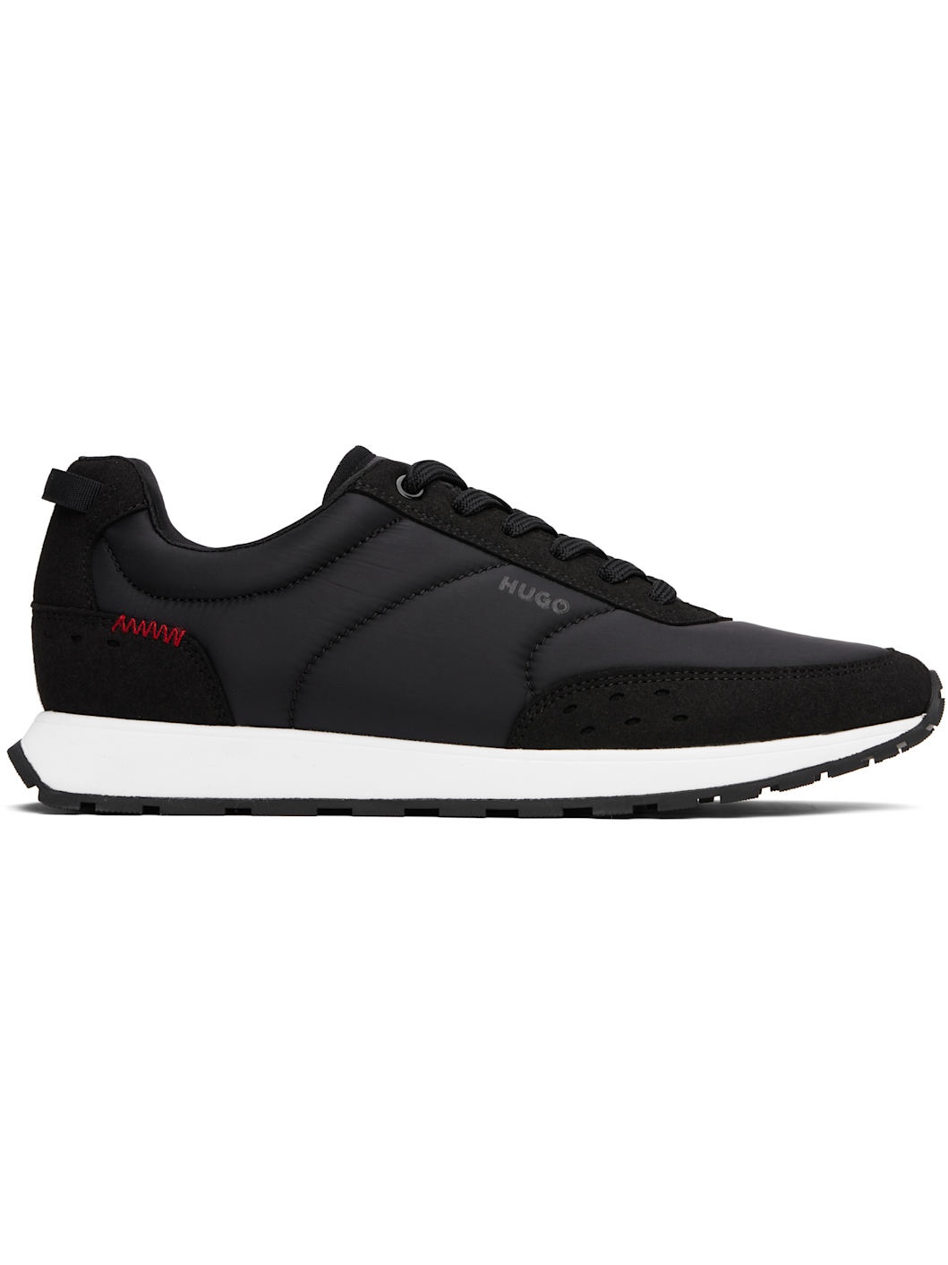 Low-top taffeta and faux-suede sneakers in black. · Lace-up closure · Logo printed at tongue and outer side · Padded tongue and collar · Logo-printed pull-loop at heel tab · Jersey lining · Foam rubber midsole · Treaded rubber sole Supplier color: Black Upper: textile, synthetic. Sole: rubber. Made in Lao Peoples Republic 252084M237015