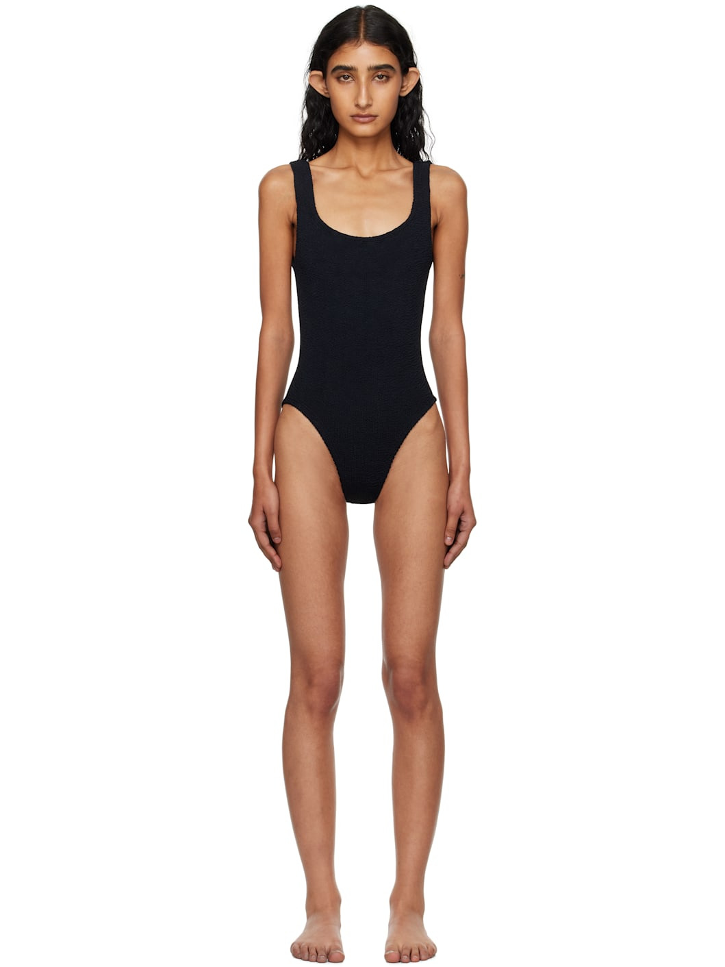 Shirred stretch nylon jersey one-piece swimsuit. · Square neck · Integrated shoulder straps · Low back · Unlined This product uses Original Crinkle™ Technology. Fits US size 2-12. Supplier color: Black 97% polyamide, 3% elastane. Made in Morocco 252431F103012