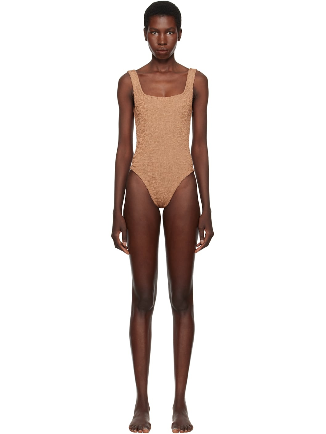 Shirred stretch nylon jersey one-piece swimsuit. · Square neck · Fixed shoulder straps · Low back · Unlined This product uses Original Crinkle™ Technology. Fits US size 2-12. Supplier color: Metallic cocao 97% polyamide, 3% elastane. Made in Morocco 251431F103055