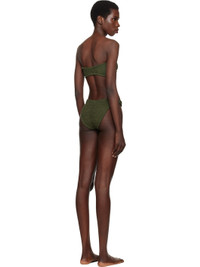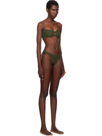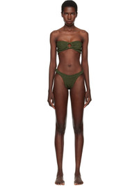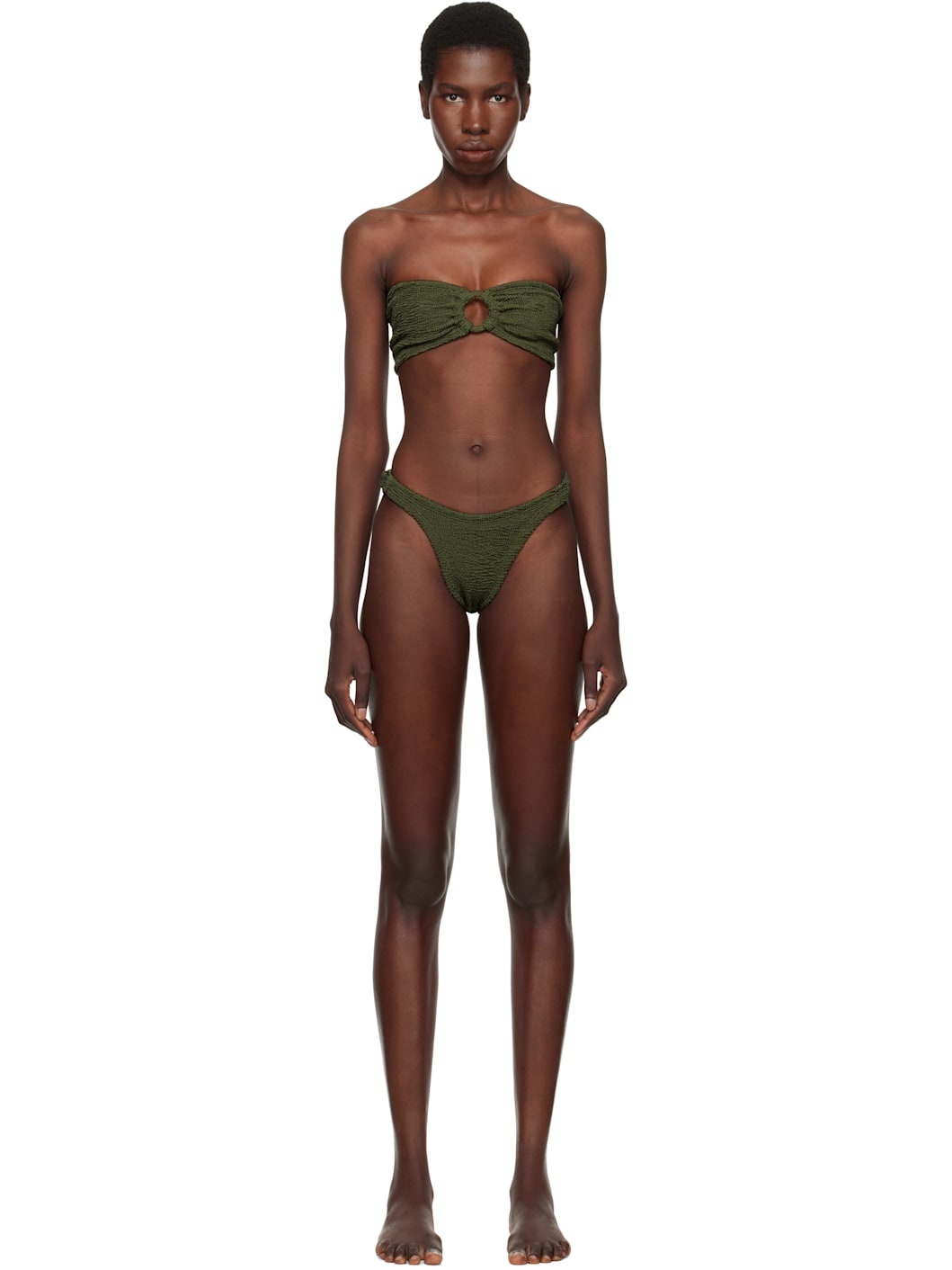 Shirred stretch nylon jersey bandeau-style bikini top. · Sweetheart neck · O-ring and gathering at chest · Unlined Shirred stretch nylon jersey bikini bottom. · Elasticized waistband · O-ring at sides · Unlined This product uses Original Crinkle™ Technology. Fits US sizes 2-12. Supplier color: Metallic khaki 97% polyamide, 3% elastane. Made in Morocco 251431F105064