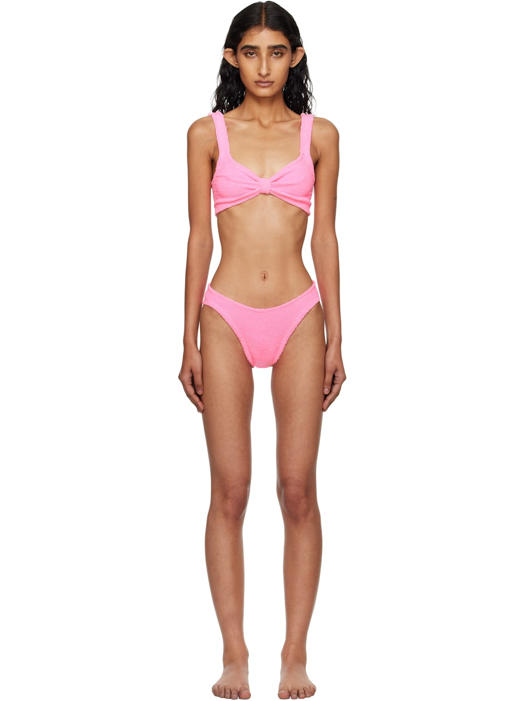 Shirred stretch nylon jersey bikini top and bottom. · Gathering at scoop neck · Integrated shoulder straps · Low back · Unlined This product uses Seamless Crinkle™ Technology. Fits US size 2-12. Supplier color: Bubblegum 97% polyamide, 3% elastane. Made in Morocco 252431F105036