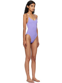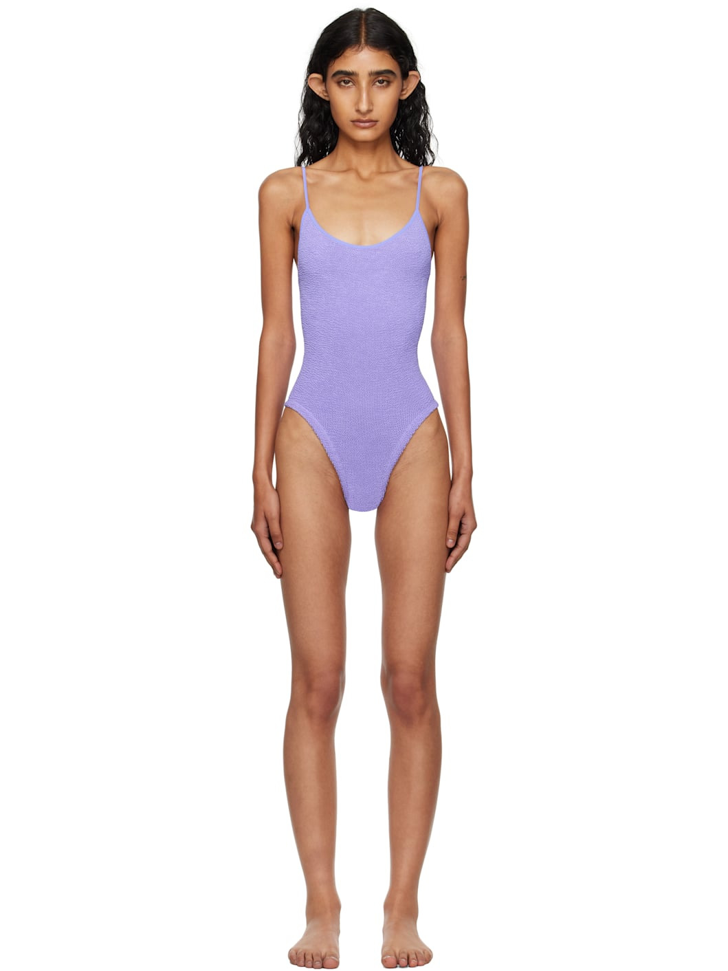 Shirred stretch nylon jersey one-piece swimsuit. · Scoop neck · Fixed spaghetti straps · Low back · Unlined This product uses Original Crinkle™ Technology. Fits US size 2-12. Supplier color: Lilac 97% polyamide, 3% elastane. Made in Morocco 252431F103015