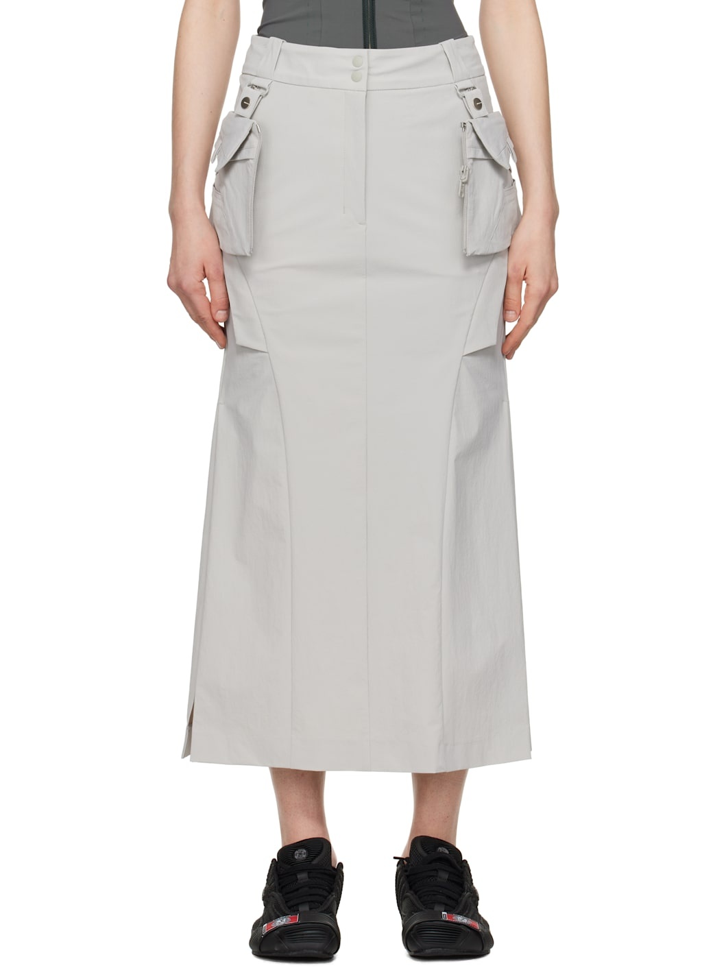 Crinkled stretch nylon crepe midi skirt. · Belt loops · Two-pocket styling · Zip fly · Vented side seams · Zip pocket at back waist · Detachable overlay for corset-style top styling Crinkled stretch nylon crepe corset-style top. · Straight neck · Zip closure · Zip pocket · Press-stud tabs at front · Cropped hem · Elasticized shoulder straps Supplier color: Fog grey 90% nylon, 10% polyurethane. Made in South Korea 251429F093000