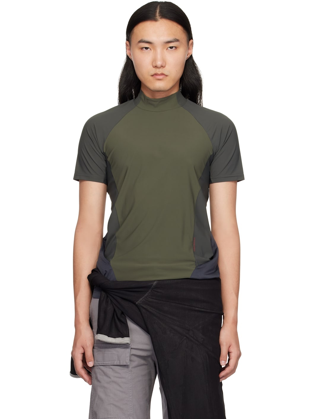 Nylon-blend jersey T-shirt. · Mock neck · Mesh straps at sides with concealed zip pockets Supplier color: Khaki Body: 77% nylon, 23% polyurethane. Trim 1: 85% nylon, 15% polyurethane. Trim 2: 92% polyester, 8% polyurethane. Made in South Korea 251429M213004