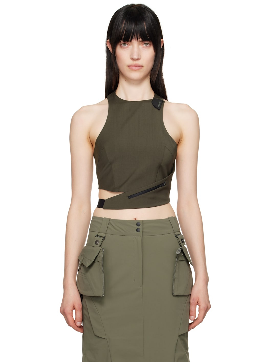 Plain-woven stretch wool-blend tank top. - Wrap construction - Logo and rubberized velcro tab at round neck - Darts at chest - Zip pocket at front - Cutout at waist - Elasticized strap at cropped hem - Racer back - Zip closure at back Supplier color: Khaki