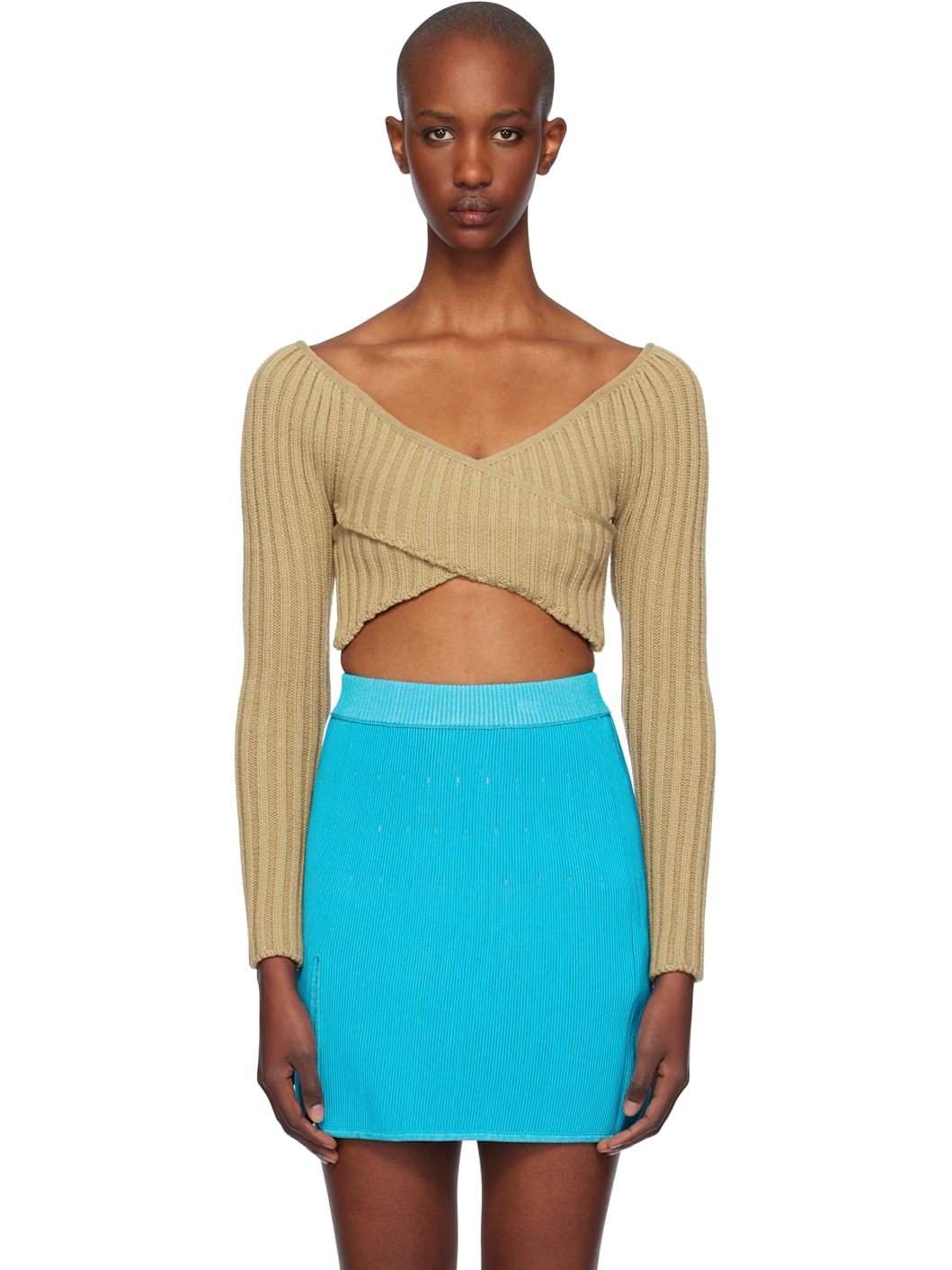 Rib-knit acrylic modified sweater. · Crisscrossing off-the-shoulder construction · Logo flag at cropped hem Supplier color: Sand 100% acrylic. Made in Indonesia 242541F096001