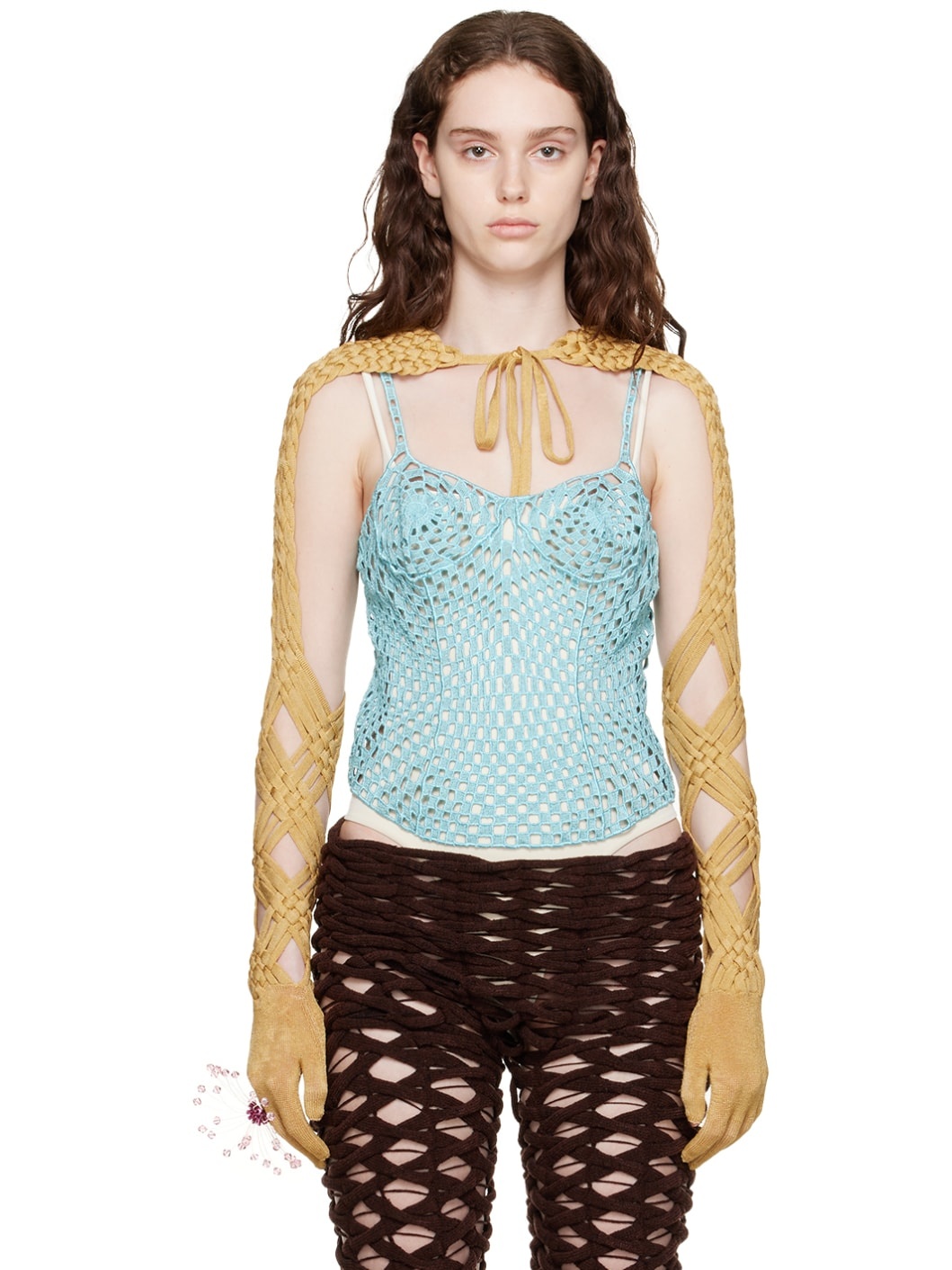 Hand-knit rayon bustier-style tank top. Cutouts throughout. · Sweetheart neck · Adjustable shoulder straps · Lace-up detailing at back Each item is unique. Please note that finishings may vary. Supplier color: Aqua 100% rayon. Made in Indonesia 231541F111044