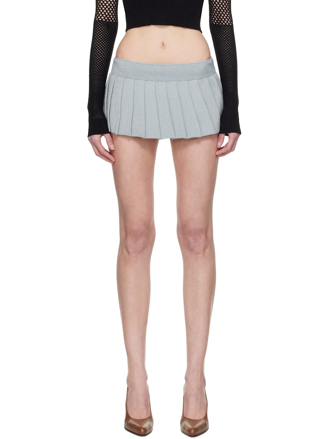 Handcrafted rib-knit stretch rayon skort. Knife pleats and metallic thread detailing throughout. Supplier color: Silver