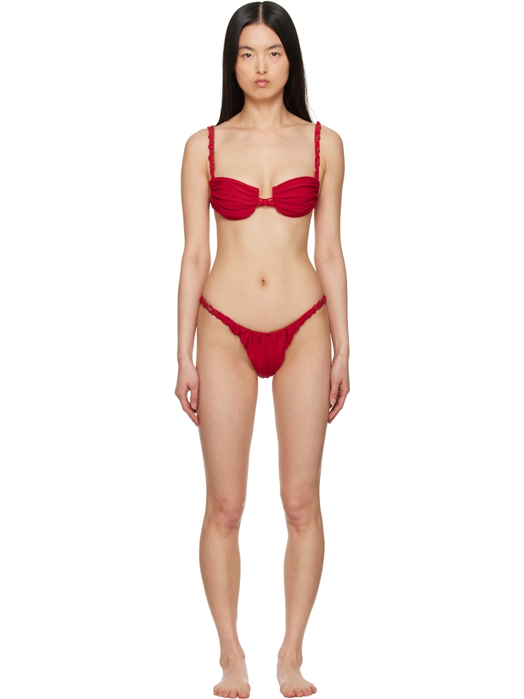 Stretch recycled nylon jersey bikini top. Braided trim throughout. · Sweetheart neck · Underwire and ruching at cups · Hook-eye closure at back · Fully lined Stretch recycled nylon jersey bikini bottoms. Ruching throughout. · Braided trim at elasticized waistband · Fully lined Supplier color: Cherryclay 78% recycled polyamide, 22% elastane. Made in Indonesia 251541F105010