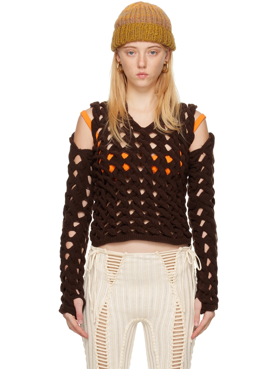 Handcrafted open cable knit stretch rayon sweater. · Rib knit hem · Detachable bolero-style sleeves Available exclusively at SSENSE. Supplier color: Soil 90% rayon, 10% elastane. Made in Indonesia 222541F096014