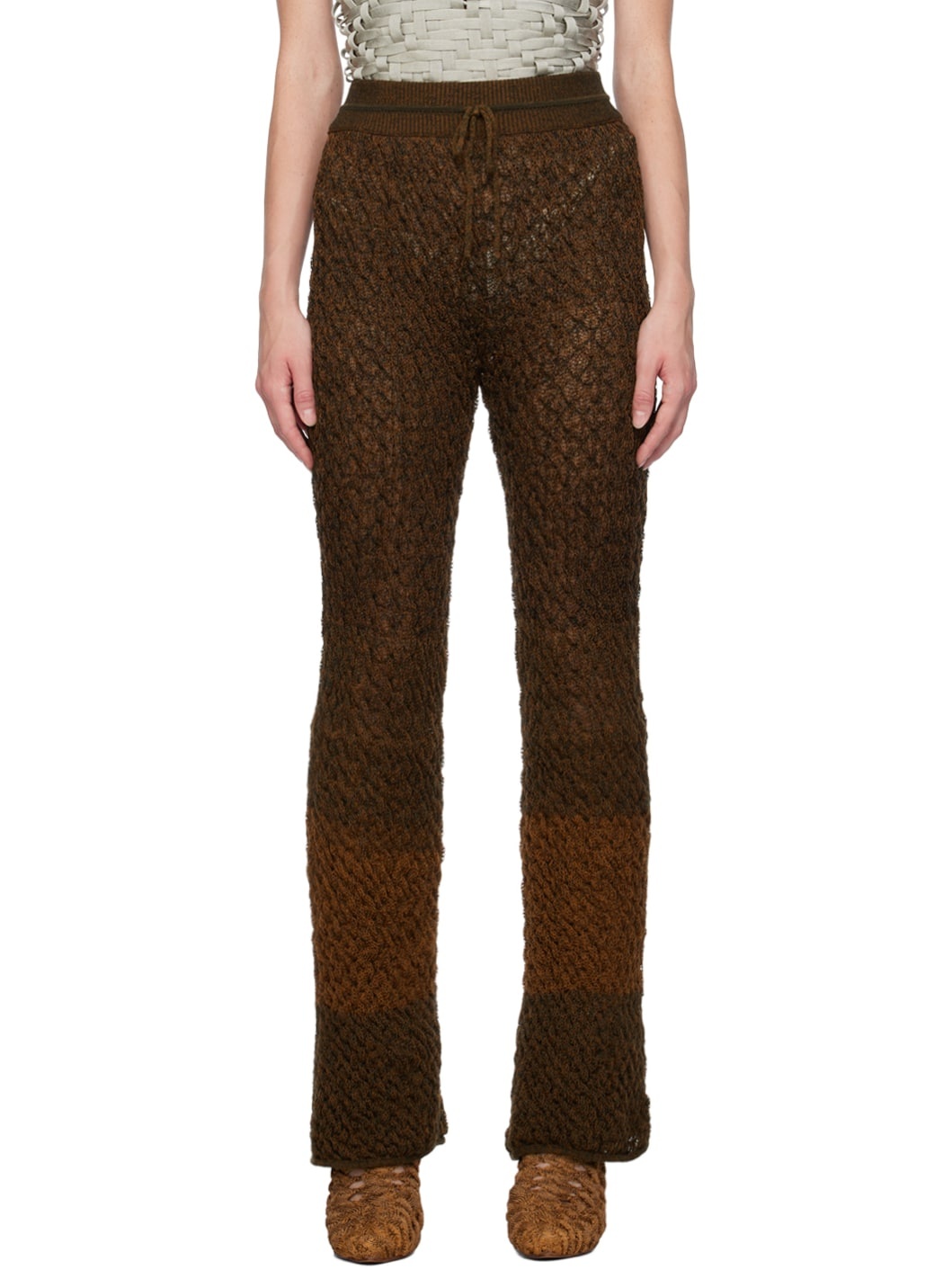 Handcrafted open knit stretch acrylic lounge pants. · Drawstring at elasticized waistband · Rib knit trim at cuffs Available exclusively at SSENSE. Supplier color: Tangerine 90% acrylic, 10% elastane. Made in Indonesia 232541F086003