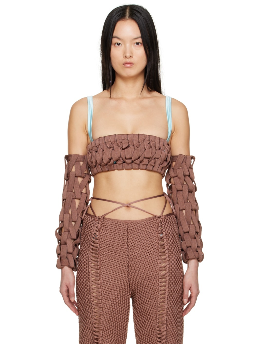 Handcrafted braided knit stretch rayon tube top and sleeves. Available exclusively at SSENSE. Supplier color: Soil 90% rayon, 10% elastane. Made in Indonesia 231541F111000