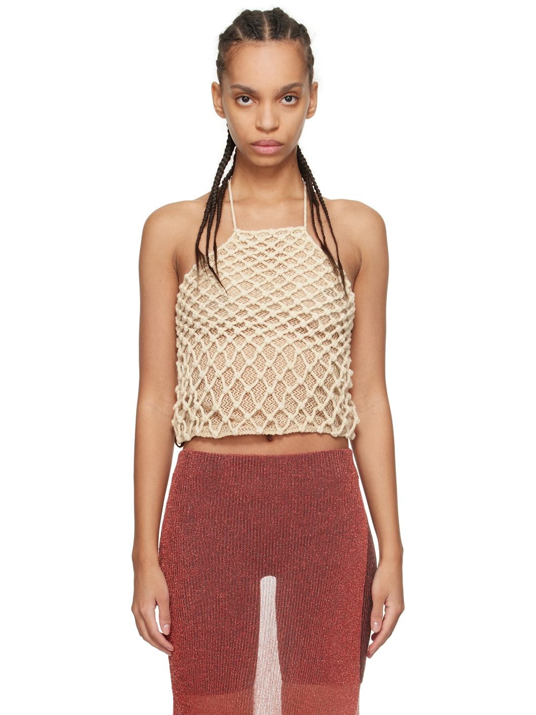 Open-knit stretch rayon-blend top. · Self-tie halter strap · Open back · Logo patch at back hem · Full mesh lining Wholesale exclusivity at SSENSE. Supplier color: Beige/Beige 90% rayon, 10% elastane. Made in Indonesia 251541F111005