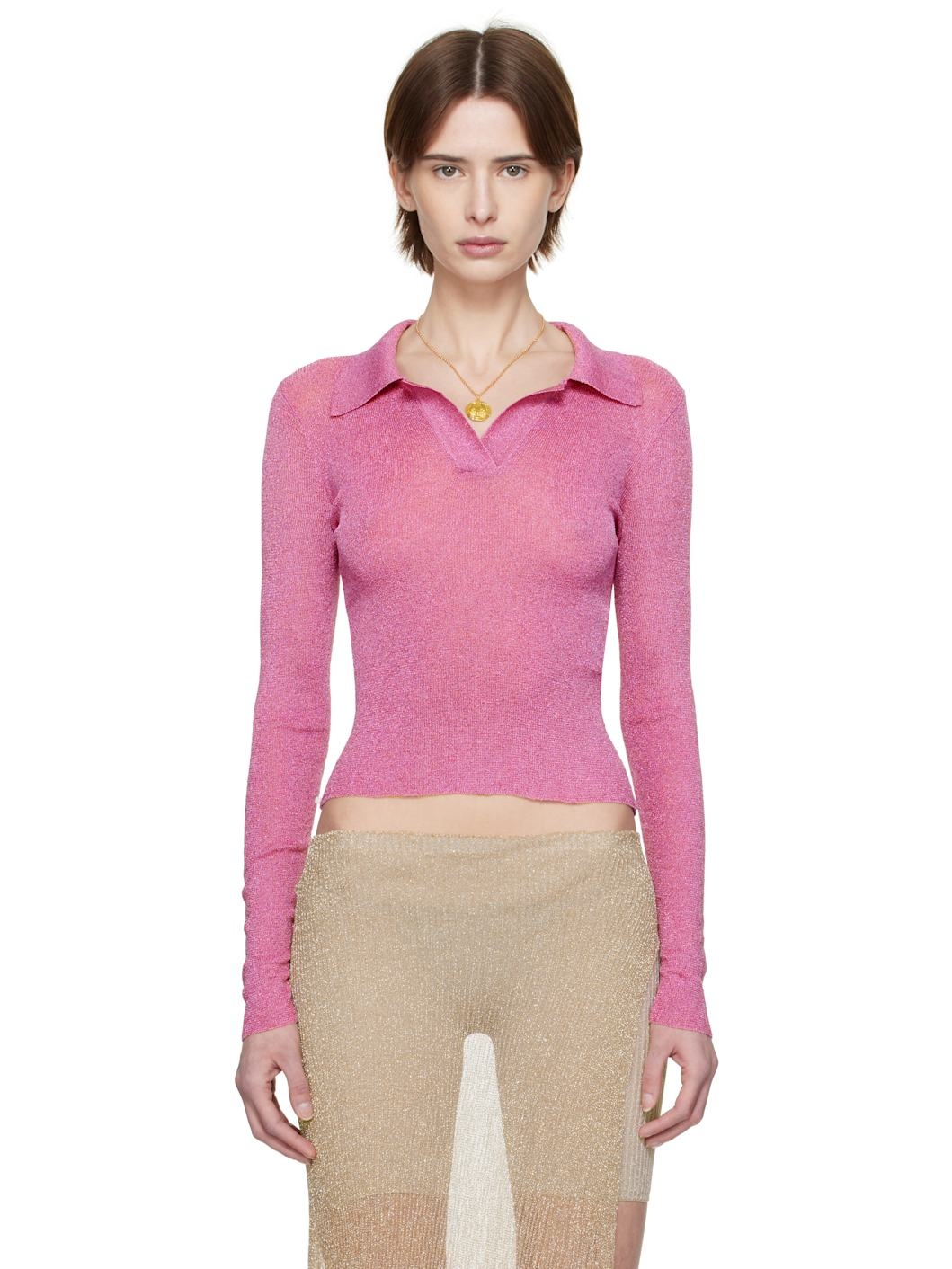 Handcrafted knit rayon polo. Metallic threads throughout. · Spread collar · Logo patch at back hem Available exclusively at SSENSE. Supplier color: Pink 100% rayon. Made in Indonesia 251541F108001