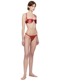Stretch nylon sateen bikini top. Braided trim throughout. · Straight neck · Ruching and underwire at cups · Crisscrossing shoulder straps · Logo-engraved clasp closure at back · Fully lined Stretch nylon jersey bikini bottoms. · Braided trim at elasticized waistband · Fully lined Available exclusively at SSENSE. Supplier color: Cherry red Body: 75% nylon, 25% elastane. Lining: 90% nylon, 10% elastane. Made in Indonesia 251541F105000