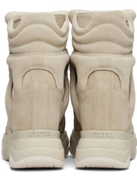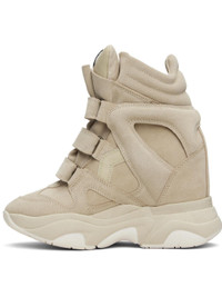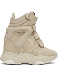 High-top calfskin suede sneakers. · Perforated detailing at toe · Velcro closure · Logo patch at padded tongue · Quilted padded collar · Cutout and logo applique at sides · Logo embossed at heel counter · Grained leather lining · Concealed wedge heel · Treaded rubber platform sole · Platform: H2" · Heel: H4" Supplier color: Beige Upper: calfskin. Sole: rubber. Made in Portugal 252600F127001