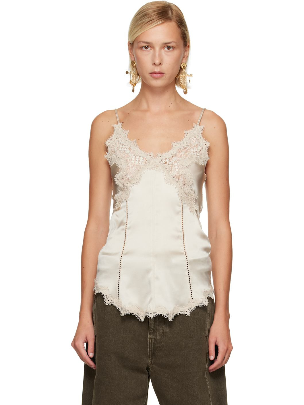 Stretch silk satin top. · Plunging V-neck · Lace trim, laddering, and scalloped raw edges throughout · Fixed spaghetti shoulder straps · Zip closure at side seam Supplier color: Champagne Body: 94% silk, 6% lycra. Trim 1: 80% cotton, 20% polyamide. Trim 2: 40% cotton, 36% viscose, 24% polyamide. Trim 3: 86% cotton, 14% polyamide. Made in Romania 252600F111005