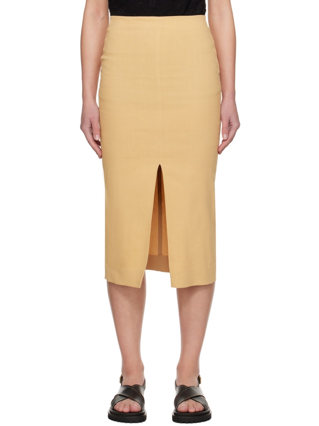 Slub stretch hemp- and viscose-blend canvas skirt. · Elasticized waistband · Central vent at front hem · Concealed zip closure at back Supplier color: Straw 58% hemp, 39% viscose, 3% elastane. Made in Portugal 241600F092004