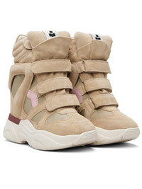 High-top suede and buffed leather sneakers. · Perforated detailing at toe · Velcro closure · Logo patch at padded tongue · Quilted padded collar · Cutout and logo applique at sides · Logo embossed at heel · Grained pigskin lining · Concealed wedge heel · Treaded rubber sole · Heel: H4" Supplier color: Beige/Pink Upper: leather. Sole: rubber. Made in Portugal 261600F127011