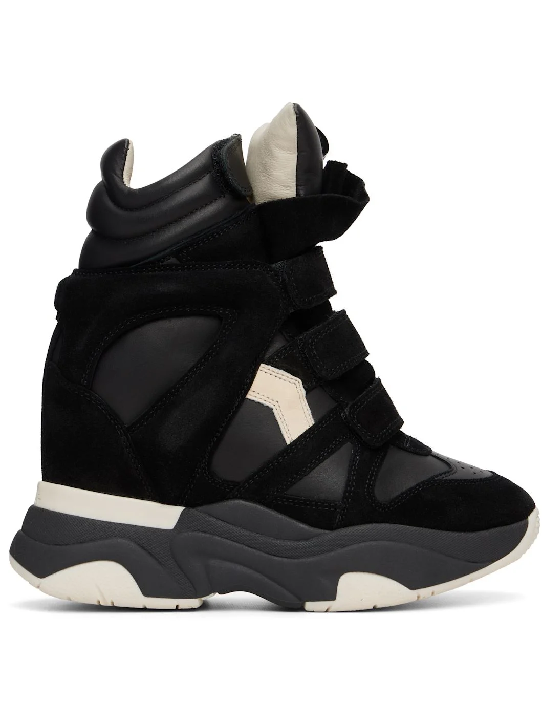 High-top paneled suede and grained leather sneakers. · Perforations at toe · Velcro closure · Logo flag at padded tongue · Padded collar · Logo applique at sides · Quilted heel tab · Logo embossed at heel counter · Grained pigskin lining · Concealed wedge heel · Treaded rubber platform sole · Platform: H2" · Heel: H4" Supplier color: Black Upper: leather. Sole: rubber. Made in Portugal 261600F127005
