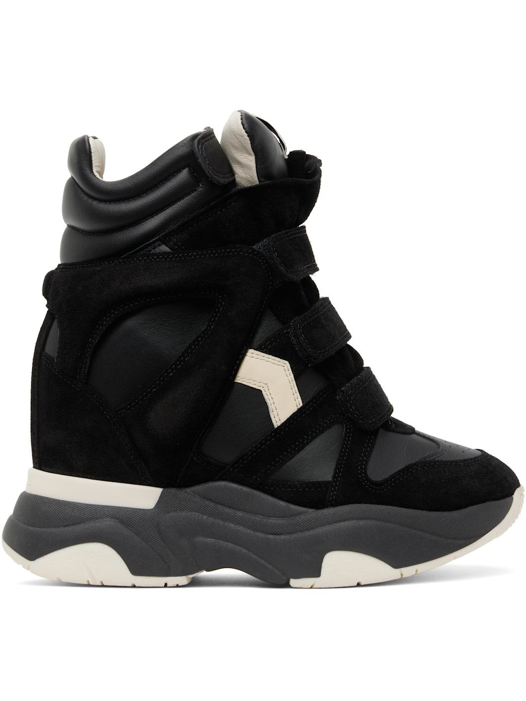 High-top suede and grained leather sneakers in black. · Perforations at toe · Velcro closure · Logo flag at padded tongue · Padded collar · Logo applique at sides · Quilted heel tab · Logo embossed at heel counter · Grained pigskin lining · Concealed wedge heel · Treaded rubber platform sole · Platform: H2" · Heel: H4" Supplier color: Black Upper: leather. Sole: rubber. Made in Portugal 252600F127000