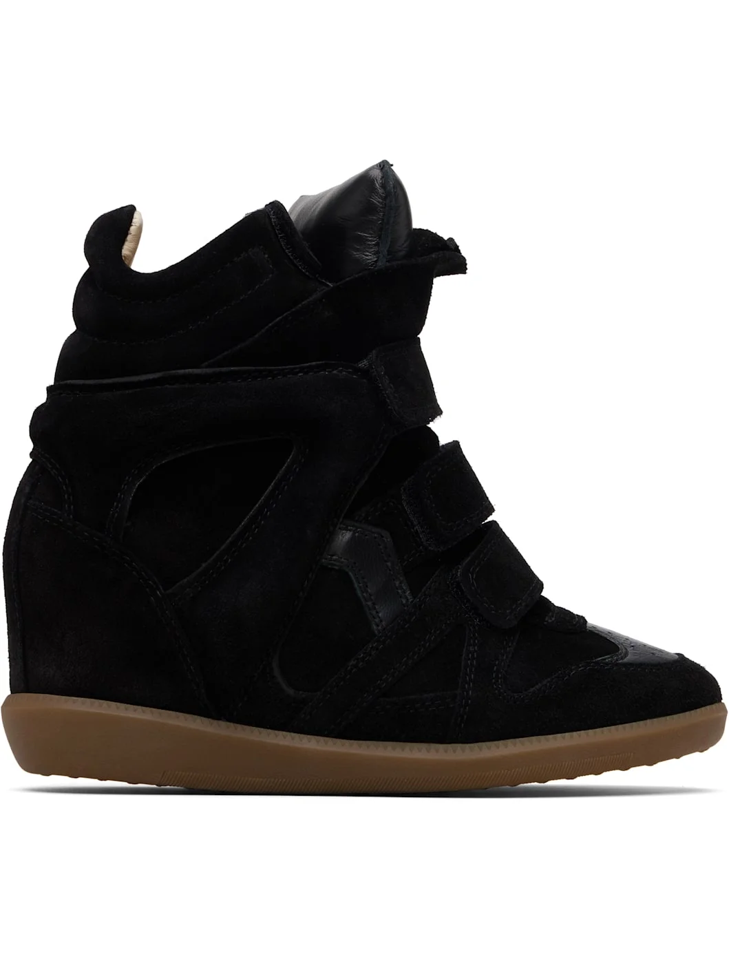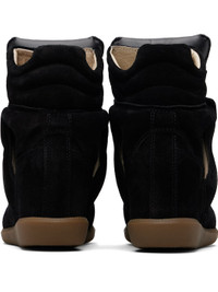 High-top suede sneakers. · Perforated detailing at toe · Velcro closure · Padded tongue · Quilted padded collar · Cutout and logo applique at sides · Grained pigskin lining · Concealed wedge heel · Treaded rubber sole · Heel: H3.25" Supplier color: Black Upper: leather. Sole: rubber. Made in Portugal 261600F127007
