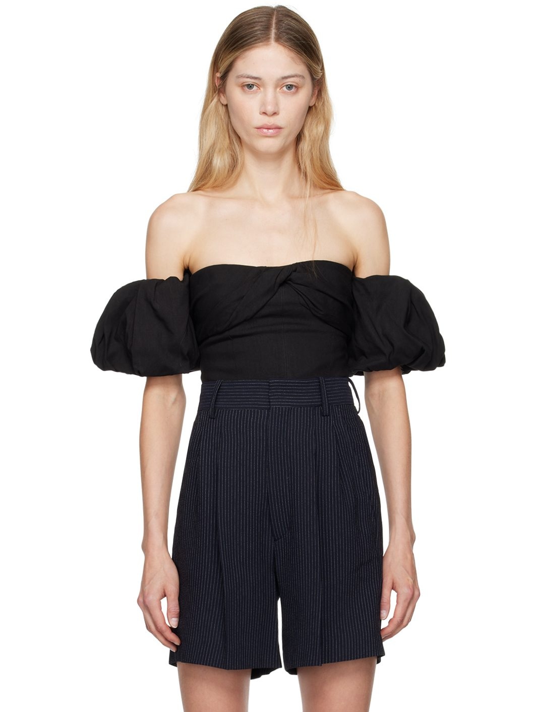 Stretch hemp -and viscose-blend broadcloth camisole. · Off-the-shoulder construction · Twisted detailing at sweetheart neck · Removable balloon sleeves with elasticized cuffs · Concealed zip closure at back · Curved hem · Full stretch cotton poplin lining Supplier color: Black Body: 58% hemp, 39% viscose, 3% elastane. Lining: 96% cotton, 4% elastane. Made in Portugal 242600F111007
