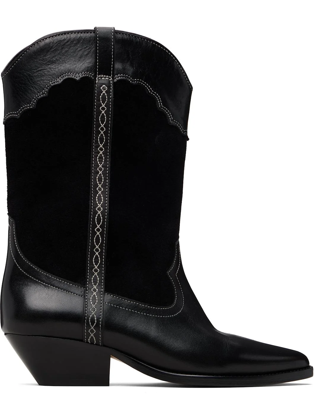 Mid-calf calfskin suede and buffed leather boots. · Pointed toe · Pull-loops at collar · Embroidered detailing at sides · Suede lining · Stacked leather heel with rubber injection · Leather sole · Heel: H1.75" Supplier color: Black Upper: calfskin, leather. Sole: leather. Made in Portugal 261600F114000